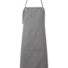 Heavyweight canvas bib apron that can also be folded down to form a half-waist apron. Rounded edges. Gunmetal/antique brass eyelets. Mitred double pocket. Adjustable knotted neckband and matching waist ties that can be fastened to the front or back. Cotton-rich with recycled polyester. Sedex certified.