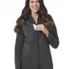 The perfect professional lightweight jacket that provides just the right amount of warmth, Modern fit, Womenโs bonded fleece jacket with raglan style sleeve, Front closed zipper, Total of 5 pockets: 1 chest zipper pocket, 2 front zipper pockets and 2 hidden pockets, Asymmetric sleeve hemline with internal knit fabric, Shoulder darts, front and back vertical seams, Front and chest pocket bags made by breathable mesh fabric