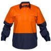2 Tone Hi-Vis Preshrunk 100% Lightweight Long Sleeve Closed Front cotton drill shirt. Underarm cool flow mesh and back bodice split with cool flow mesh. Double breasted pockets with pen divisions. 4 Plastic button closure with gusset sleeves.