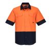 2 Tone Hi-Vis Preshrunk 100% Lightweight Short Sleeve cotton drill shirt. Underarm cool flow mesh and back bodice split with cool flow mesh. Double breasted pockets with pen divisions. Full Plastic button closure.