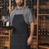 Cross back Denim Bib Apron with antique brass eyelets and studs,contrast denim stitching. Apron includes 4 front pockets and 2 top pen pockets.