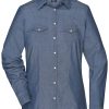 Light Denim Cotton Classic Rear Yoke 2 Breast Pockets Jn628: Press Studs In Mother-of-Pearl Look Conspicuous Backstitch Seams Rounded Hem