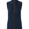 Sleeveless gilet with contrast trim detail. High-neck rounded collar, leading into a two-way zipper. Two zipped external pockets and two internal open pockets. Front panel detail and curve to the back hem. Contrast fabric hook on back of collar for hanging up. Wrap certified. Sedex certified. BSCI certified.